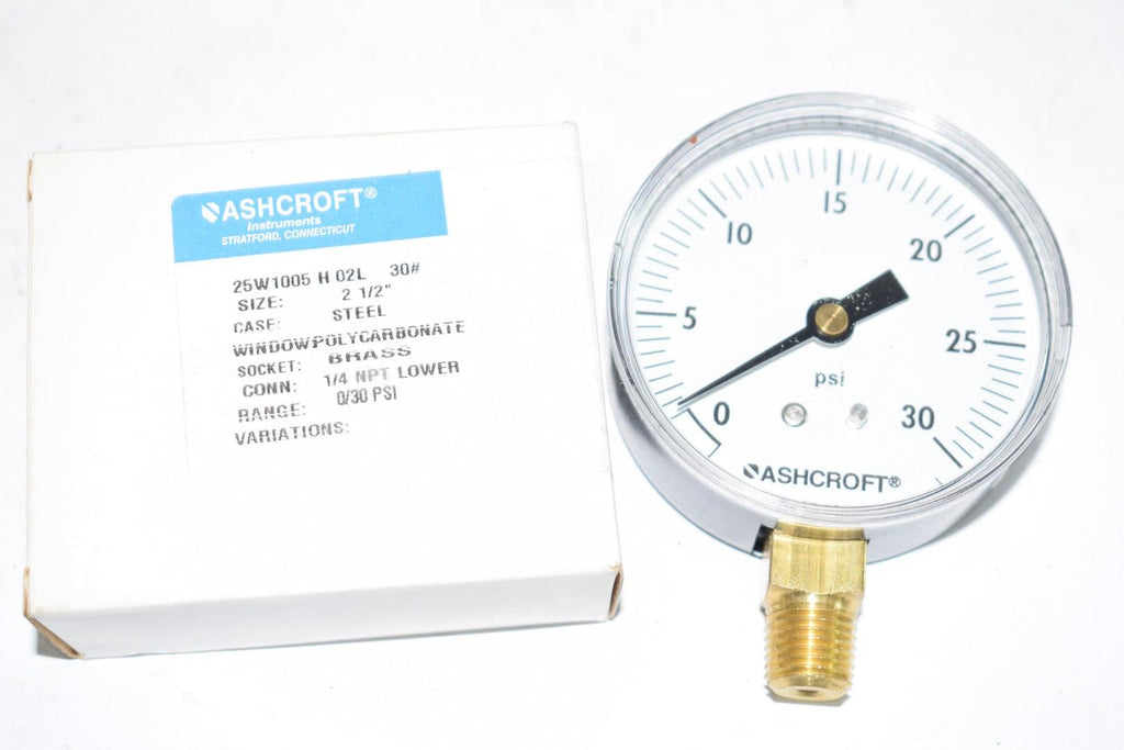 NEW Ashcroft 25W1005H02L30 Size: 2-1/2'' x 1/4'' NPT Lower Connection 0/30 PSI Pressure Gauge