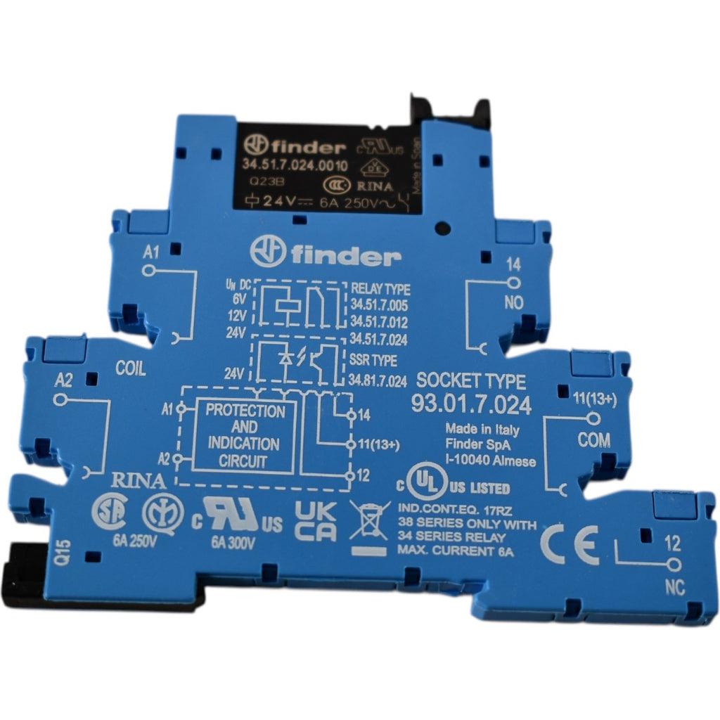 • Relay (34.51.7.024.0010): 24VDC coil, SPDT (Single Pole Double Throw) contacts, 6A switching current, 5-pin configuration.