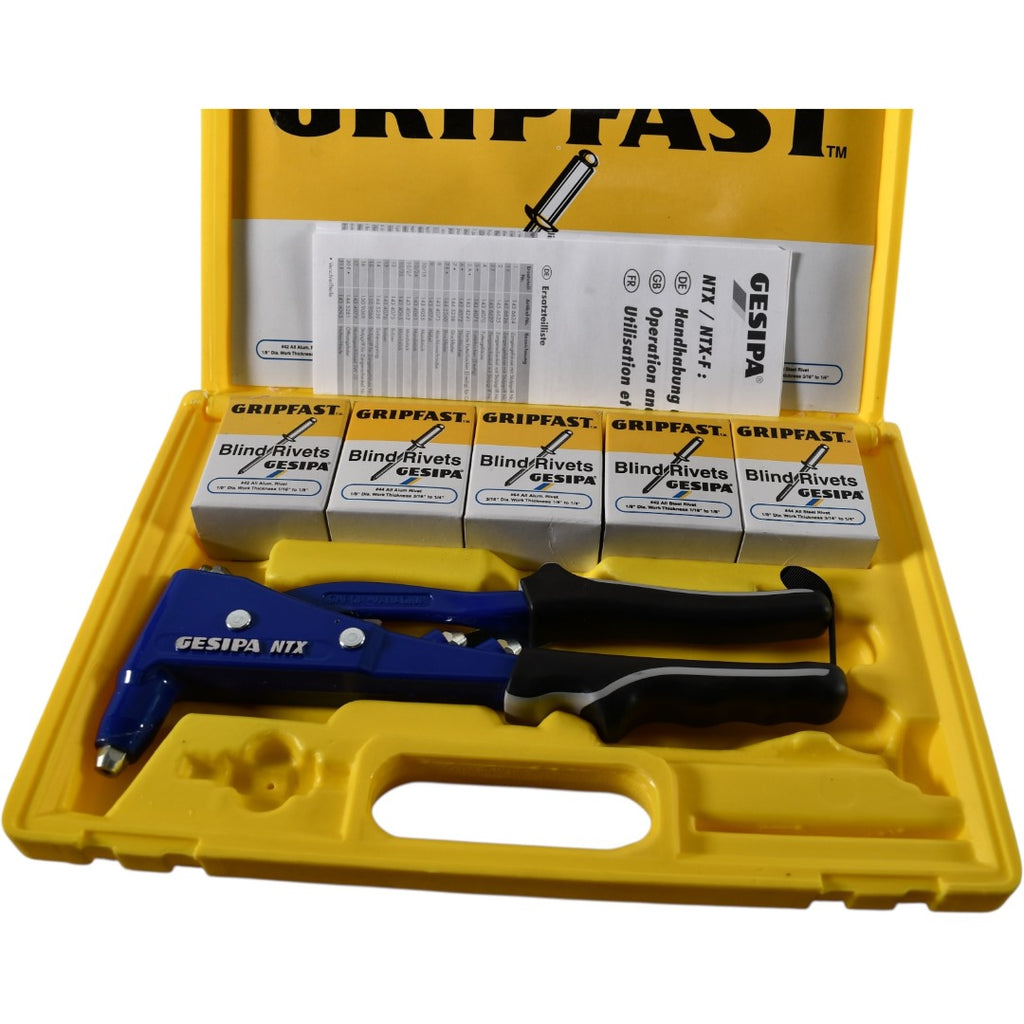 • Kit Contents: Includes the heavy-duty NTX riveter, instruction manual, and five sealed boxes of assorted "Gripfast" aluminum/steel blind rivets.