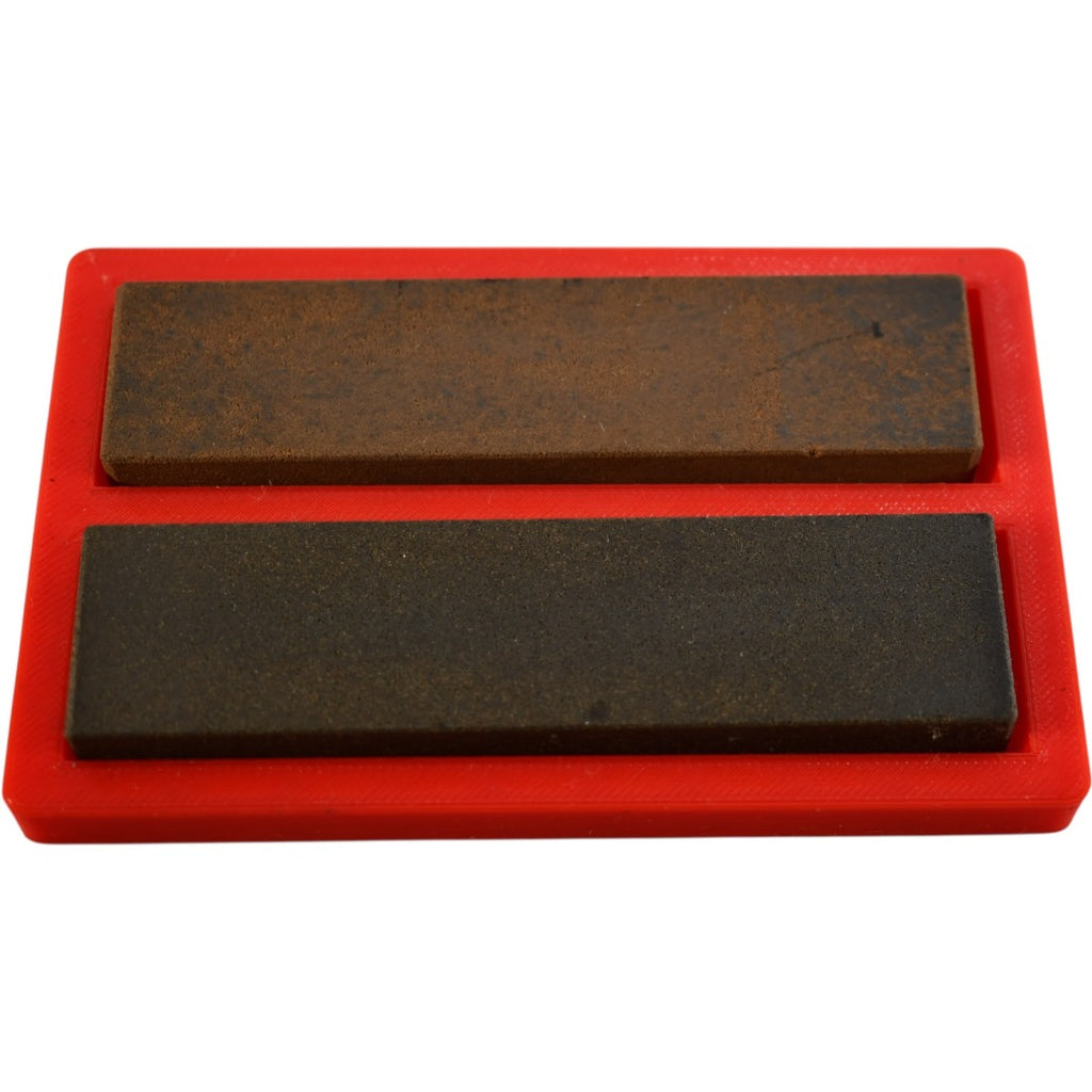 - Material: Aluminum Oxide. One stone is coarse (100 grit, brown) and one is fine (320 grit, orange).
