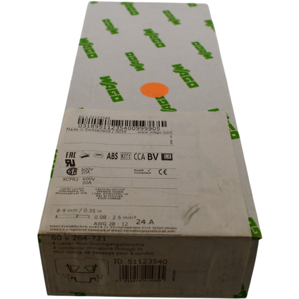 Pack of 60 NEW Wago 264-721 Terminal Block Connector 4 Position Feed Through Gray 12-28 AWG
